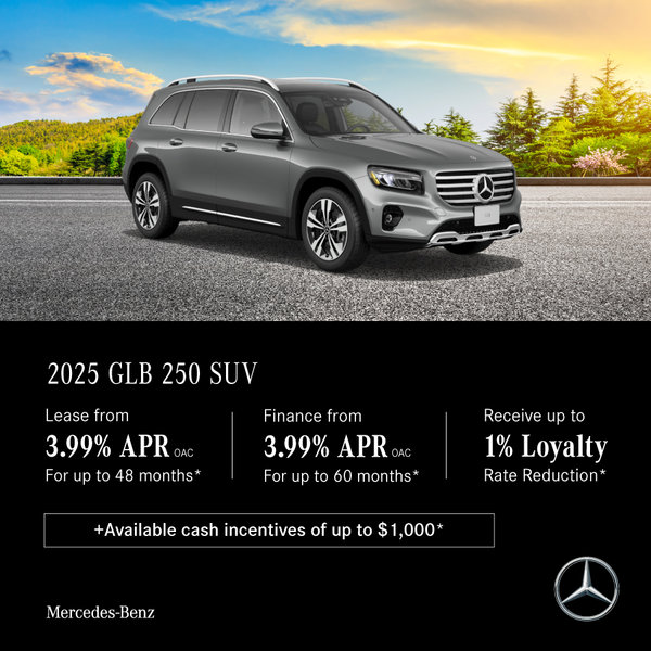2025 GLB 250 4MATIC SUV is $57,633.46 *Offer provided through Mercedes-Benz Financial Services on approved credit. Representative lease example based on 2025 GLB 250 4MATIC SUV. 2.99% lease APR for 48 months. Bi-Weekly payment is $288.82 + HST & LIC with $0 down payment or equivalent trade-in, $700 security deposit and first monthly payment due at lease inception. $3,995 freight and PDI due on delivery. Total lease obligation is $39,130.65. Option to purchase at the end of the term is $27,979.00 12,000 kilometre allowance per year; charge of $0.20/km for excess kilometres. Excess wear-and-tear charges may apply. 48 monthly payments required. All advertised prices and lease payments due at signing include $695.00 dealer administration fee, up to $125 fuel surcharge, $100.00 air-conditioning charge, up to $27.15 tires levy, $12.50 OMVIC fee, $288.81 floor mats, $238.92 wheel locks and all other applicable fees and charges. Dealer may sell or lease for less. Dealer order/trade may be necessary. Offers are subject to change or cancellation without notice and cannot be combined with any other offers (except as specified herein). Offers end December 31, 2025 or while quantities last.